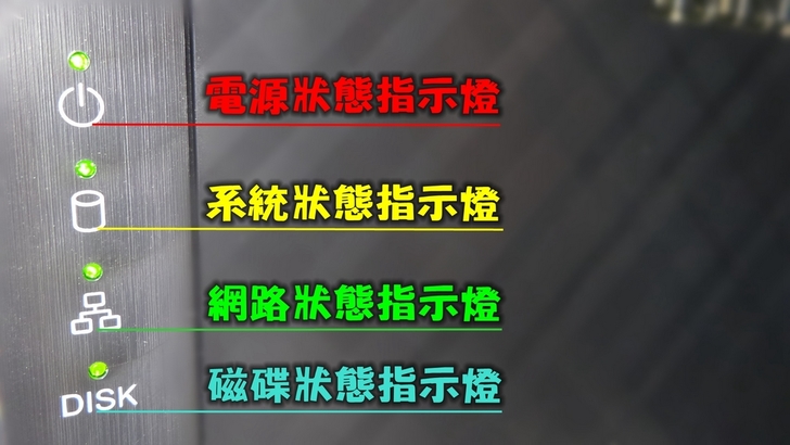 【▼】AS3202T正面左側的指示燈號,由上而下為電源狀態指示燈、系統狀態指示燈、網路狀態指示燈與硬碟狀態指示燈,正常運作時都呈現綠色燈號。