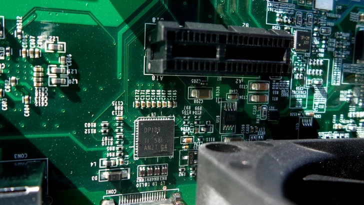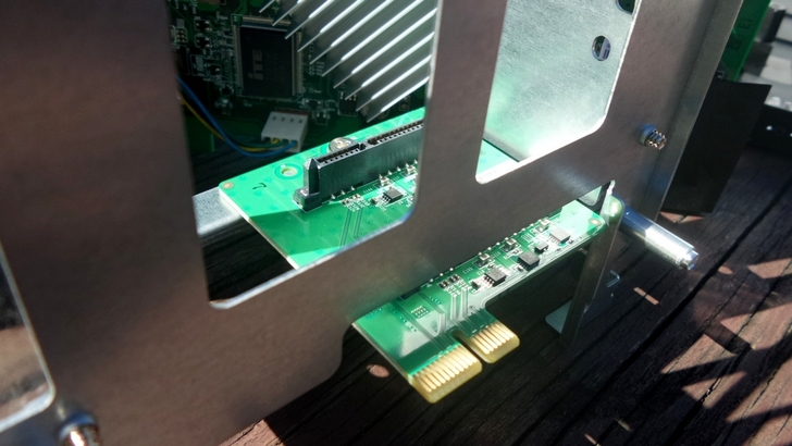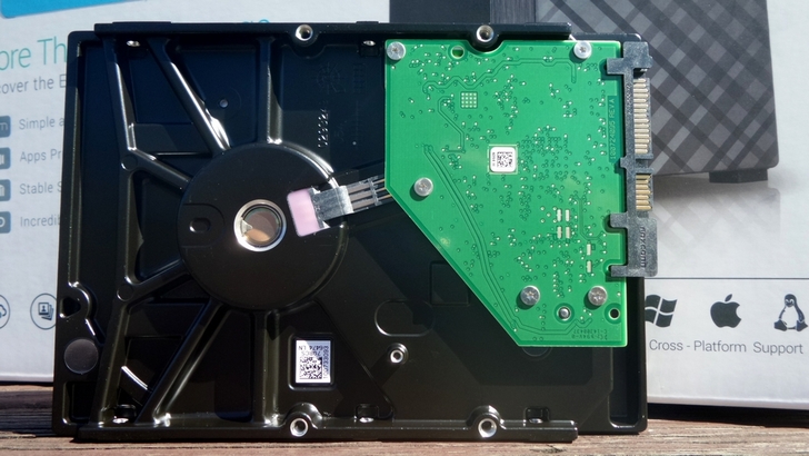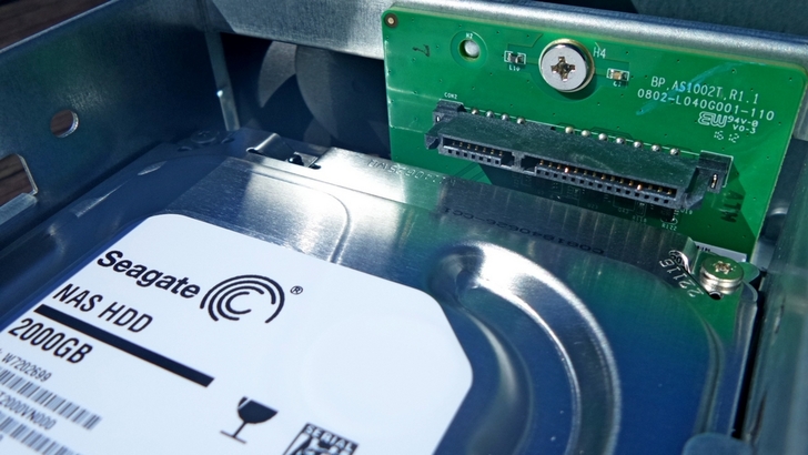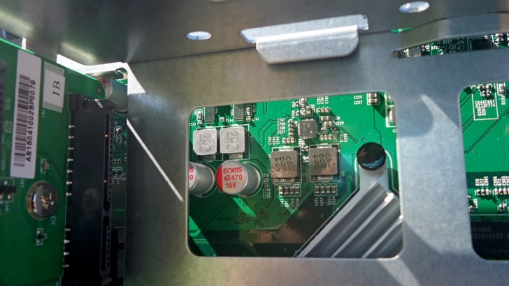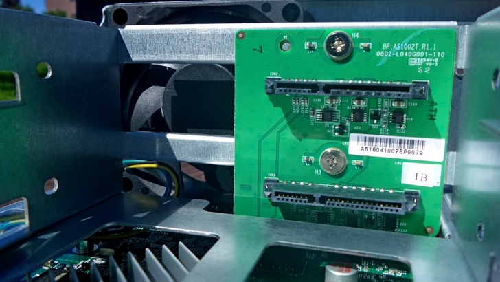 【▼】連接3.5吋硬碟的SATA介面,可以看見2Bay的板子上寫著AS1002T,代表這一系列的NAS都採用相同穩定的電路板。
