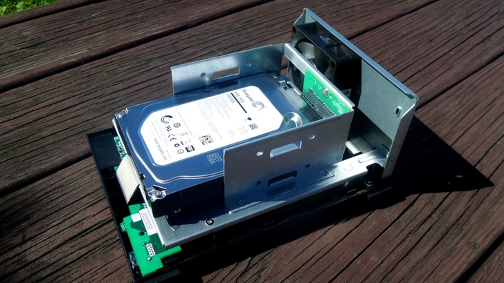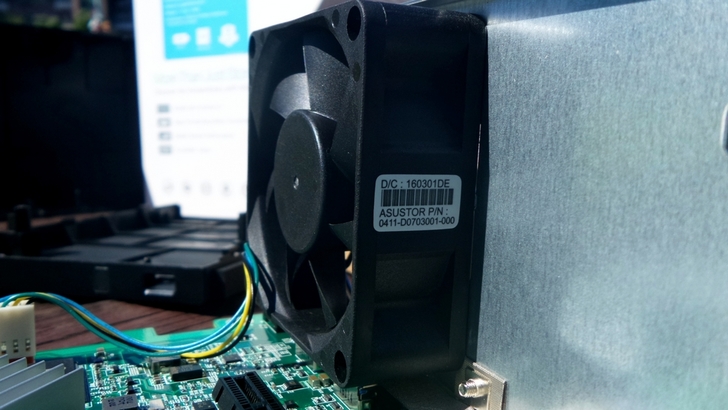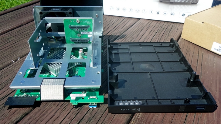 【▼】AS3202T與機殼分離的狀況,可以看見3.5吋硬碟托架佔了大部分的面積,離背後的散熱風扇約只有1cm不到的距離,能直接且迅速將運作中的硬碟熱氣給排出。