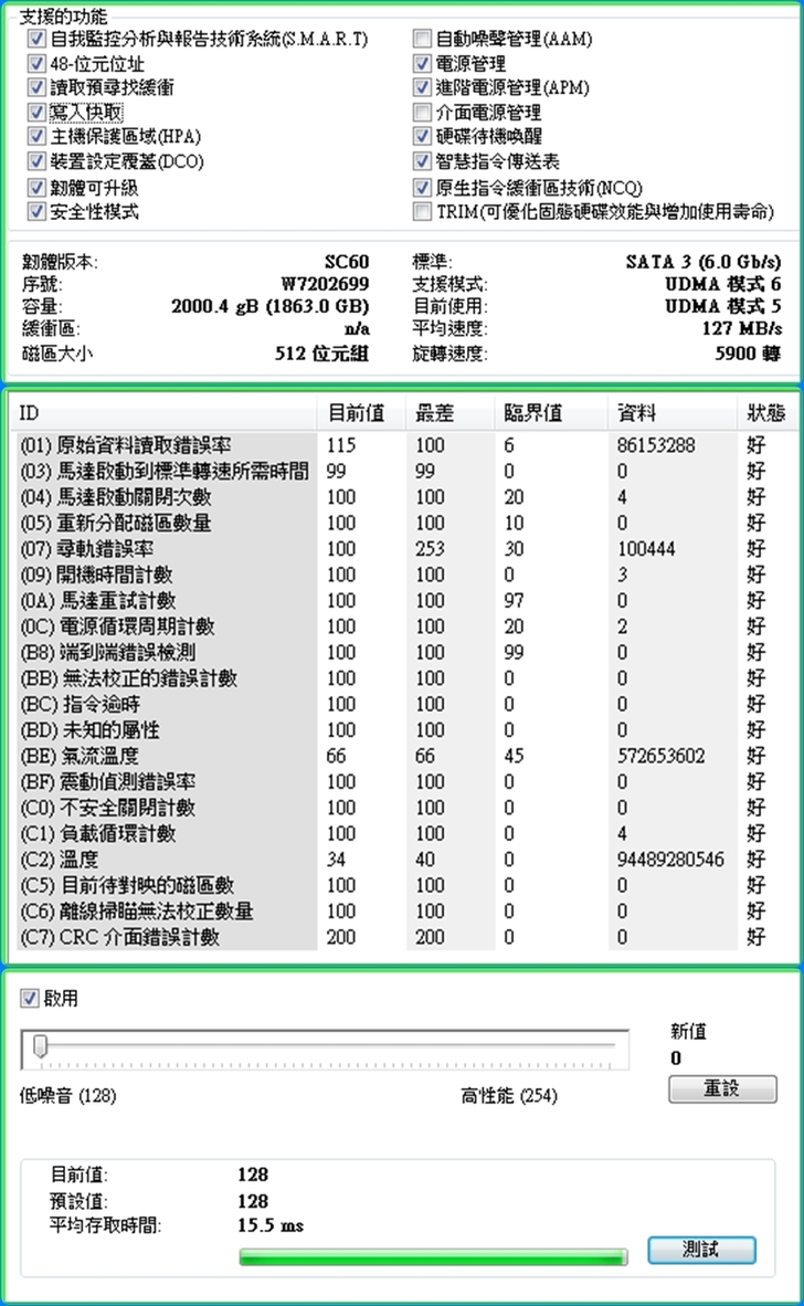 【▼】以HD Tune進行測試,可看見Seagate NAS碟支援S.M.A.R.T、寫入快取與韌體升級,標準SATA-III介面,轉速為5900RPM,非常低噪音,放在房間或客廳都很合適。