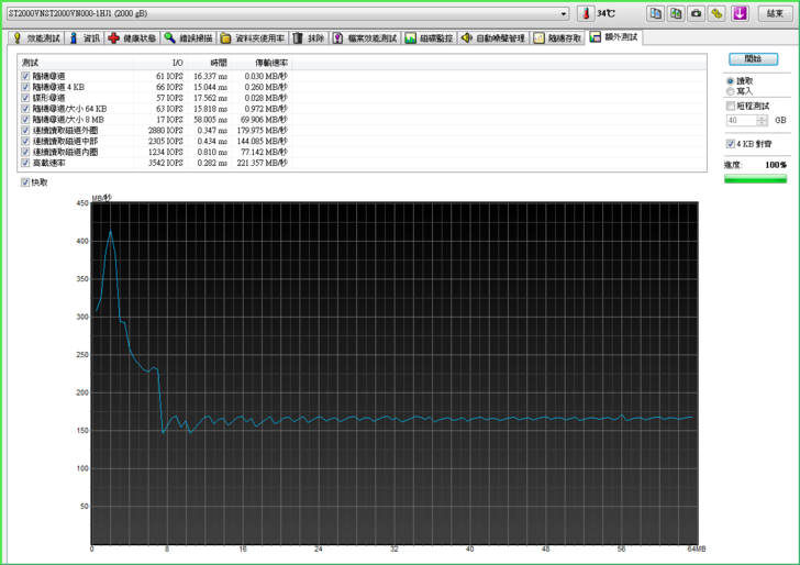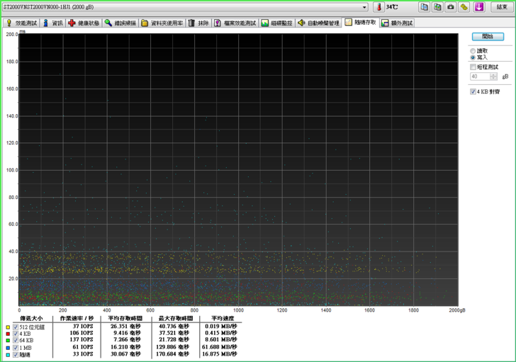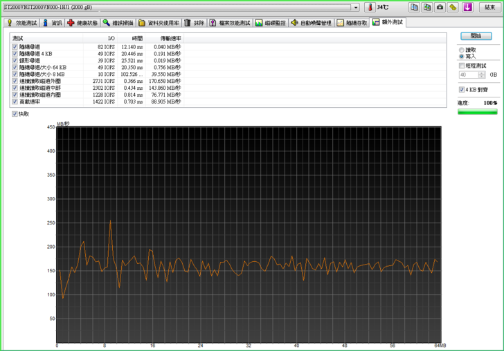 【▼】在HD Tune額外測試測寫入時,以平均連續讀取磁道外圈來看,I/O為2731 IOPS,讀取時間為0.366ms,傳輸速率為170.658MB/s。