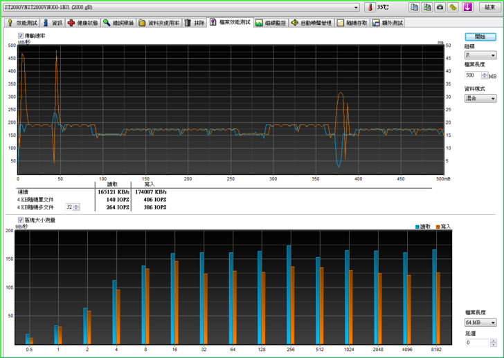 【▼】以HD Tune進行檔案效能(混合資料模式),連續讀取為165121 KB/s,連續寫入為174087 KB/s。