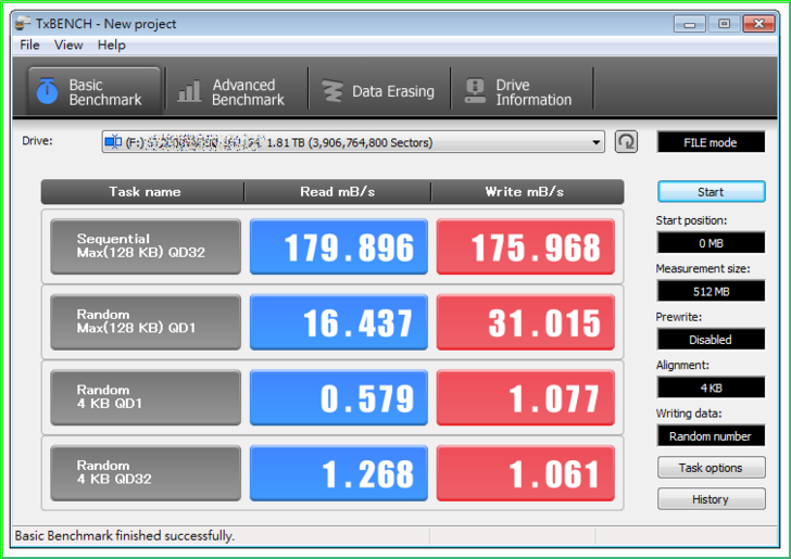 【▼】以TxBENCH進行測試QD32(Max 128KB),連續讀取為179.896MB/s,連續寫入為175.968MB/s