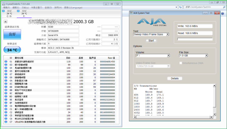 【▼】以AJA System Test進行Sweep Video Frame Size Test(測試條件File SIze=1GB),並以CrystalDiskInfo觀察狀態,寫入為163.6MB/s,讀取為168.6MB/s。