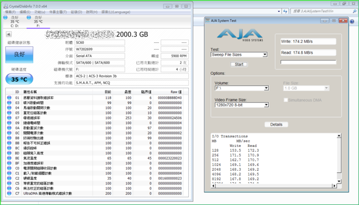 【▼】以AJA System Test進行Sweep File Sizes Test(Video Frame Size=1280x720@8-bit),並以CrystalDiskInfo觀察狀態,寫入為174.2MB/s,讀取為174.8MB/s。
