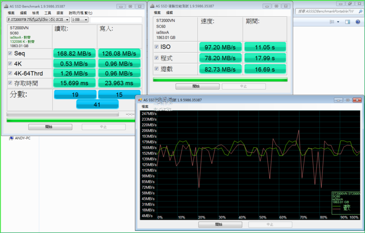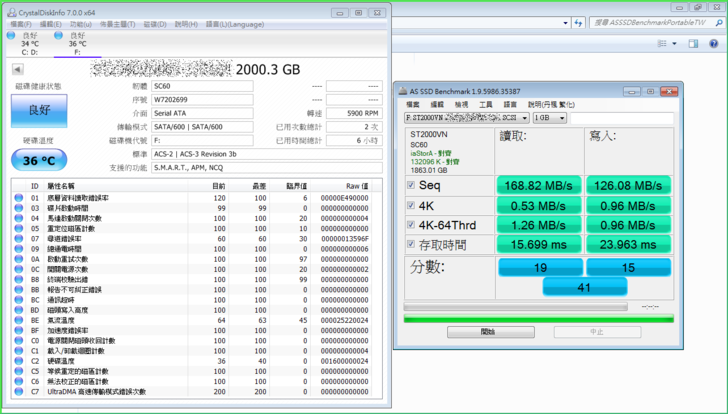【▼】以AS SSD Benchmark進行讀寫測試,,並以CrystalDiskInfo觀察狀態,連續讀取為168.82MB/s,存取時間為15.7秒,分數為19;連續寫入為126.08MB/s,存取時間為24秒,分數為15,總分為41分。