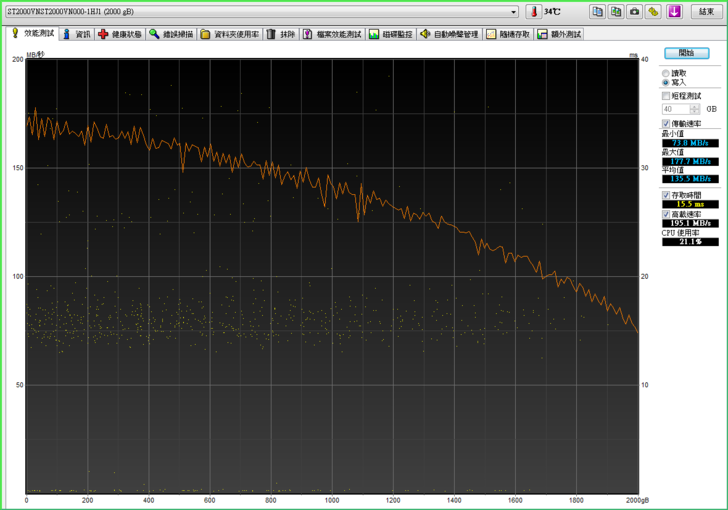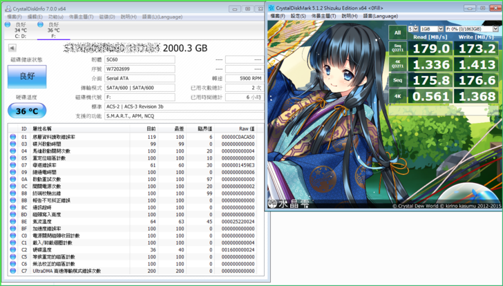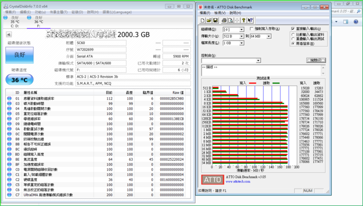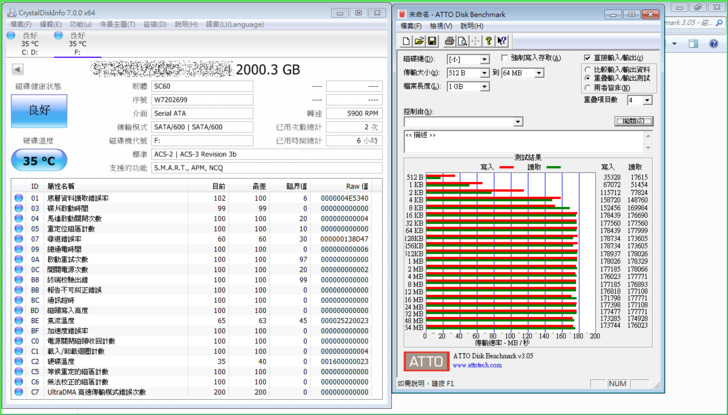 【▼】以CrystalDiskMark進行讀寫測試(測試資料為填滿0),並以CrystalDiskInfo觀察狀態,連續讀取寫入分別為179MB/s與173.2MB/s。