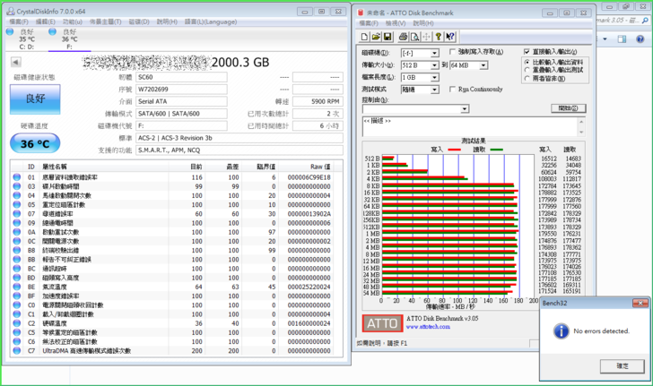 【▼】以ATTO Disk Benchmark進行讀寫測試(測試檔案大小為1GB,比較輸入/輸出資料,測試模式為隨機),並以CrystalDiskInfo觀察狀態,比起00000000模式,讀寫較為穩定有每秒170MB。