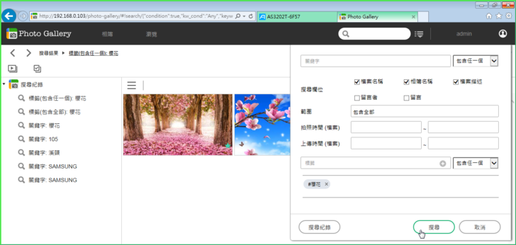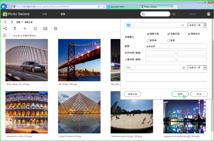 【▼】Photo Gallery提供了檔案搜尋的功能,能依檔案名稱、相簿名稱、檔案描述、留言者、留言內容、拍照時間、上傳時間與標籤快速找到您的照片。