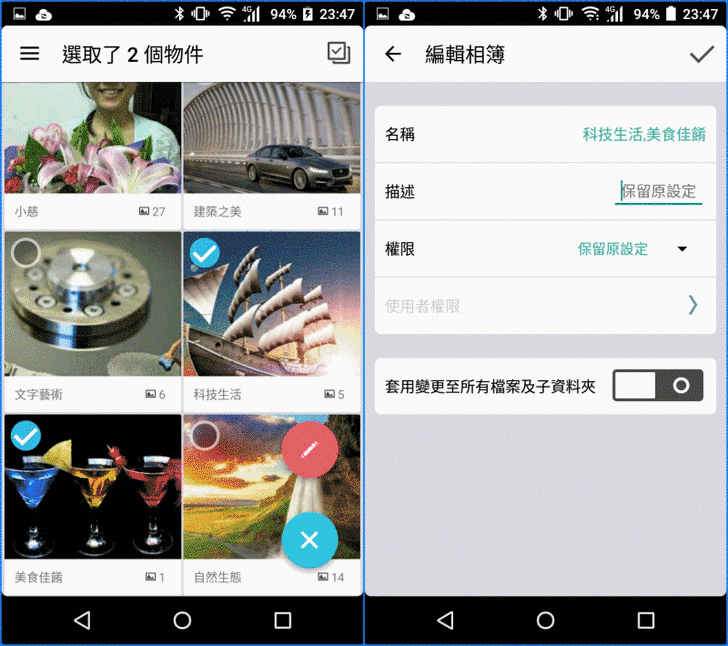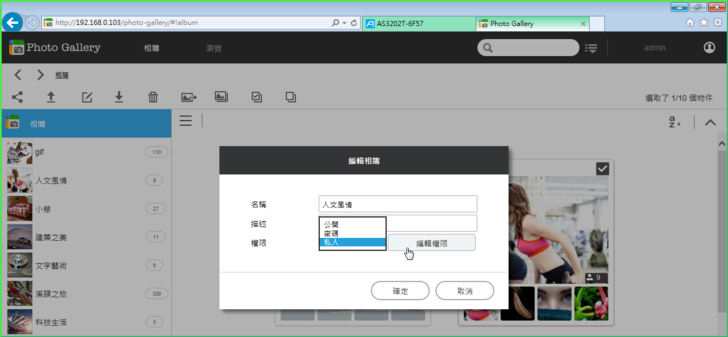 【▼】每個相簿都能設定私人、公開、密碼等權限設定,若有子目錄也可以將其套用。
