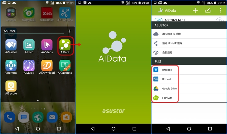 【▼】前述多媒體都有分別開起的App,如照片是AiFoto、影片是AiVideos,而聲音是AiMusic,也許大家會覺得我只是在本機觀看而已,為什麼要這麼麻煩?的確這三種有App有特別的功用,但只是簡單看或聽的話,小編在此再推薦一個Asustor推出的行動檔案總管AiData,AiData 將 Dropbox / Box.net / GoogleDrive / FTP服務整合進來,可以利用AiData 管理雲端資料。下載到本機後透過第三方App就可以播放囉~