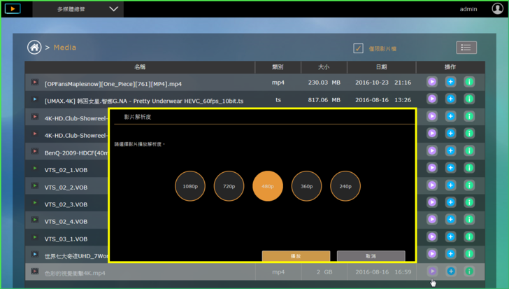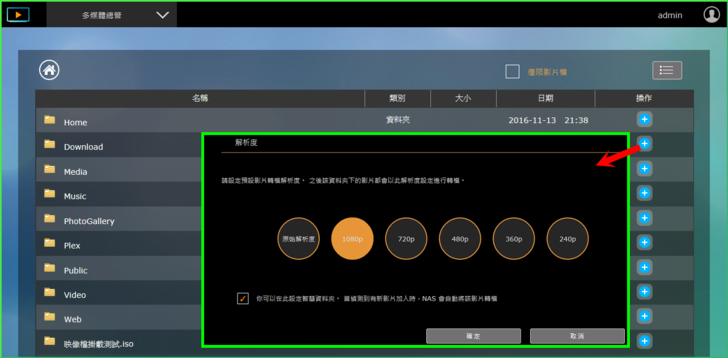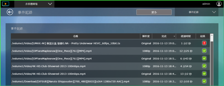【▼】NAS 搭配 intel CPU 硬體即時轉碼功能讓原本播放裝置不支援的媒體影像格式,轉換為支援的格式再傳送至你的播放裝置.即使是高解析度 1080p 影片即時轉碼都是小菜一疊。 轉檔速度雖不是很快,但重點是可以邊看邊轉,而且不會延遲,若有多個檔案要轉也會依序排在佇列當中,是否轉檔成功也可透過事件紀錄來遠端查閱。