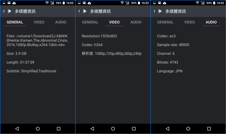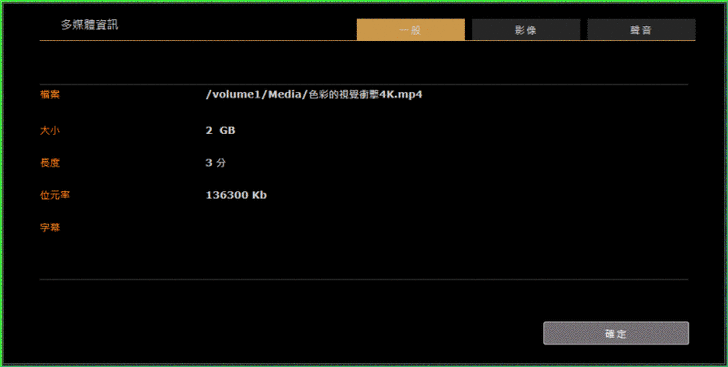 【▼】檔案的多媒體資訊提供了有一般訊息、視訊與聲音,一般訊息內有檔案大小、影片長度與字幕資訊等,視訊內容則有解析度與編碼方式,而聲音內可知編碼、取樣率、聲道數、比特率與語言。
