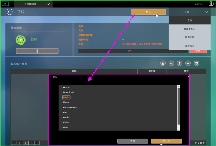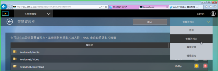 【▼】AiVideos->下載位置,其實應該是下載任務的進度,這部分希望ASUSTOR下次軟體改版可以改回正確語意,這邊任務進度可分成本地檔案與下載中兩種。