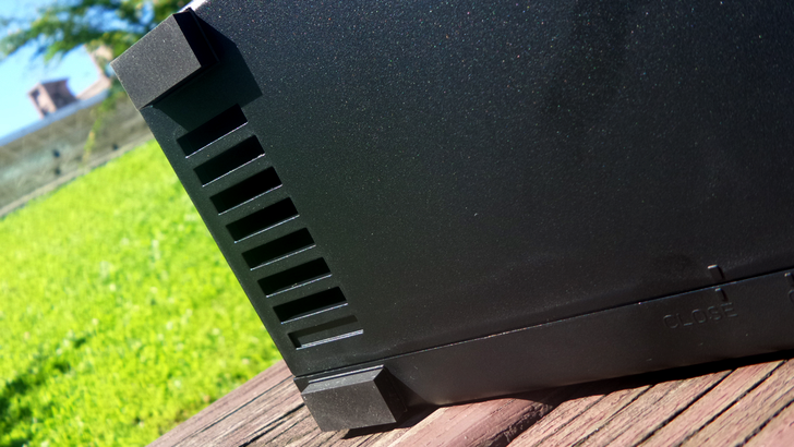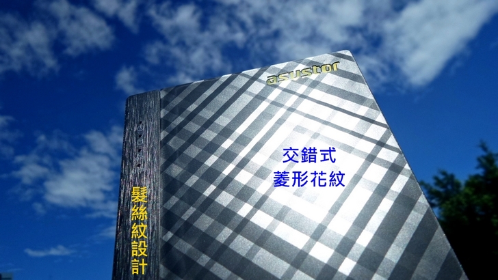 【▼】正面相當吸睛的AS3202T,機身左側面板為髮絲紋設計,右側大面積採菱形花紋交錯設計,右上角則刻有金色Asustor Logo來增加質感。