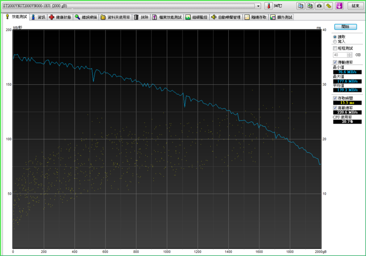 【▼】在HD Tune額外測試測讀取時,以平均連續讀取磁道外圈來看,I/O為2880 IOPS,讀取時間為0.347ms,傳輸速率為179.975MB/s。