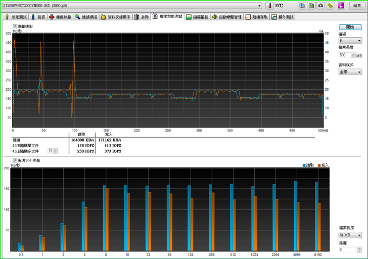 【▼】以HD Tune進行檔案效能(全零資料模式),連續讀取為164098 KB/s,連續寫入為171162 KB/s。