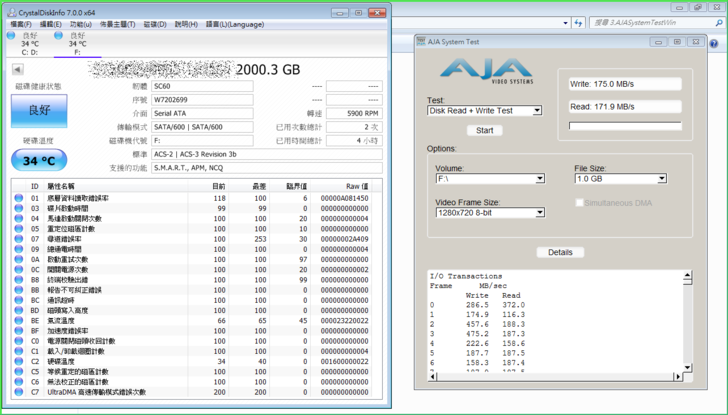 【▼】以AJA System Test進行Disk Read+Write Test(測試條件File SIze=1GB、Video Frame Size=1280x720@8-bit),並以CrystalDiskInfo觀察狀態,寫入為175MB/s,讀取為171.9MB/s。