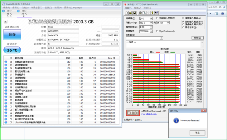 【▼】以ATTO Disk Benchmark進行讀寫測試(測試檔案大小為1GB,重疊輸入/輸出測試),並以CrystalDiskInfo觀察狀態,從16K開始就呈現穩定的讀寫速度,皆有每秒175MB以上。