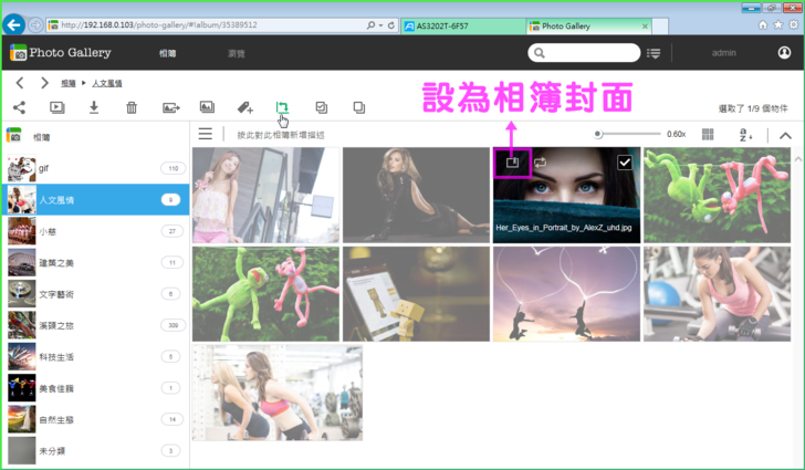 【▼】在選取單一相簿時,可以針對該相簿進行分享與上傳的動作,但若選擇兩個相簿以上,就無法進行分享與上傳,只能進行基本的權限編輯、下載、刪除、移動、複製等基本檔案操作功能。