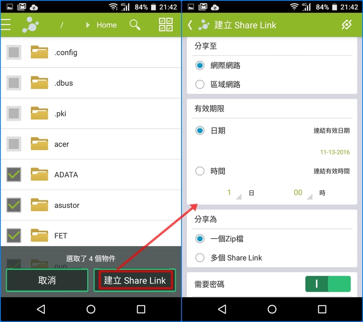 【▼】AiDatad可以在資料夾或是檔案上建立Share Link,在Share Link中可決定於分享於網路網路或是區域網路,而有效日期、分享連接方式與密碼也都可自訂。