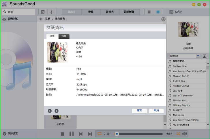 【▼】在SoundsGood中的音樂檔案,選取後按滑鼠右鍵可以查看標籤內容,包刮了有音樂類型、檔案大小、編碼格式、位元率、取樣頻率與儲存路徑等資訊。