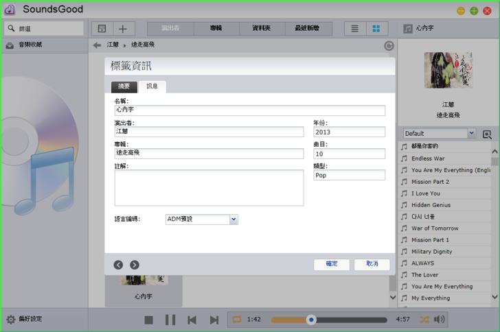 【▼】而管理音樂收藏的 ID3 標籤,SoundsGood也內建的 ID3 標籤編輯器可讓您立即編輯您的音樂收藏 ID3 標籤,不再需要額外的軟體來管理龐大的音樂庫了。