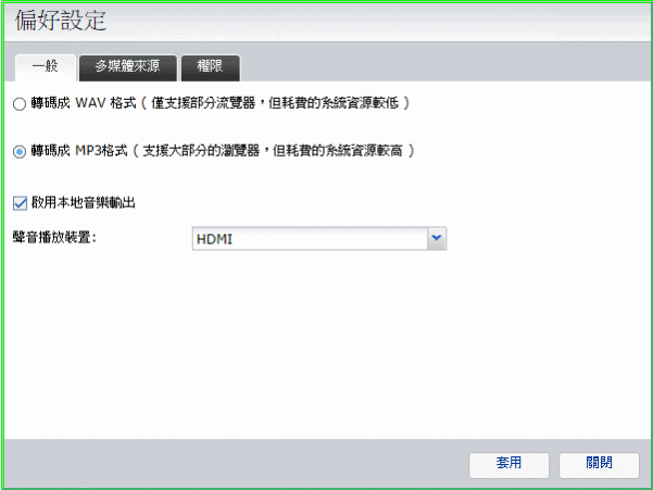 【▼】SoundsGood中的偏好設定能選擇音樂轉碼格式,由於AS3202T沒有特殊的音效介面,所以本地音樂輸出也只能透過HDMI;多媒體來源的部分,可選擇大夥的公用資料夾/Music,或是選擇個人化設定,選擇個人化的話,就必須調整權限囉~