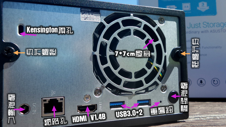 【▼】在AS3202T連接介面,除了前方有一組USB3.0連接埠之外,背面有電源輸入孔、RJ-45網路孔、HDMI V1.4B、兩組USB3.0連接埠、重置按鈕與電源開關,機身上還有Kensington鎖孔與嵌入7*7cm的散熱風扇,與機殼分離處更提供不用工具就可手拆的兩顆快拆螺絲供換硬碟使用。