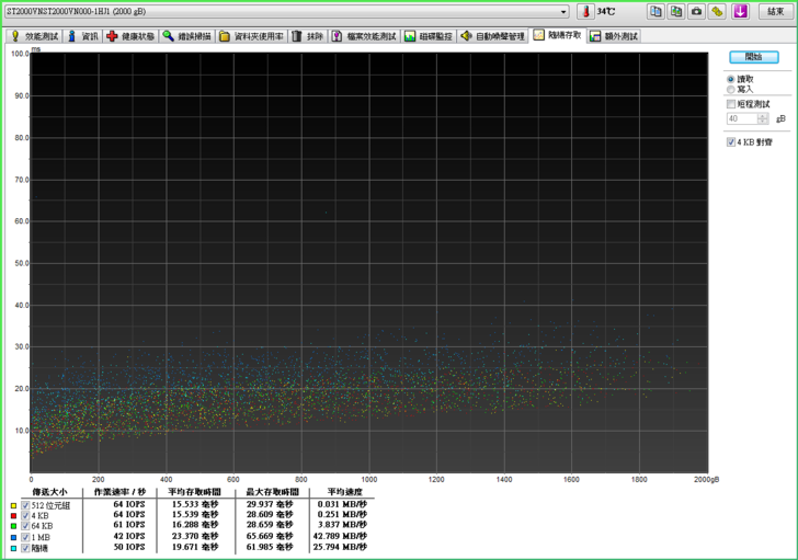 【▼】以HD Tune進行隨機讀取,以隨機大小來看作業速率為50 IOPS,平均存取時間為19.671ms,最大存取時間為61.985ms,平均速度為25.794MB/s。
