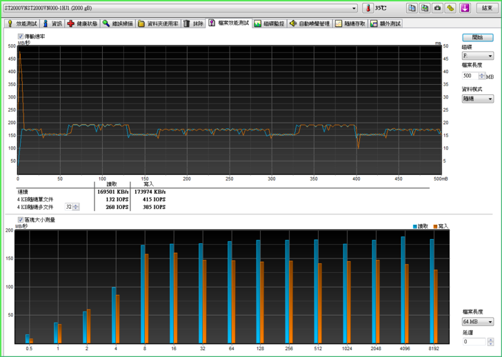 【▼】以HD Tune進行檔案效能(隨機資料模式),連續讀取為169501 KB/s,連續寫入為173974 KB/s。
