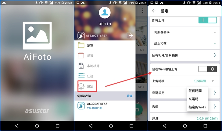 【▼】AiFoto主要選單有瀏覽、相簿、本地相簿、任務與設定等,其中設定能設定即時上傳,並同步備份本機內所有相片與影片,如果沒辦吃到飽,也可選在穩定的WI-FI環境下才進行上傳,時間也能自行選擇任何時間、充電時或指定的WI-FI。