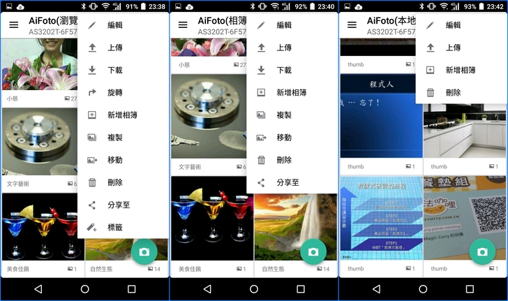 【▼】AiFoto瀏覽、相簿與本地相簿的操作功能,瀏覽比相簿多了標籤與旋轉功能,至於本地相簿功能最少,只能編輯、上傳、新增相簿與刪除。