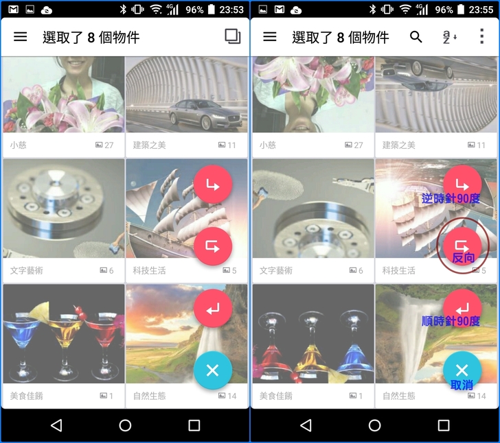 【▼】選取相簿後可針對相簿內的所有照片進行逆時針90度、反向與順時針90度的轉換。