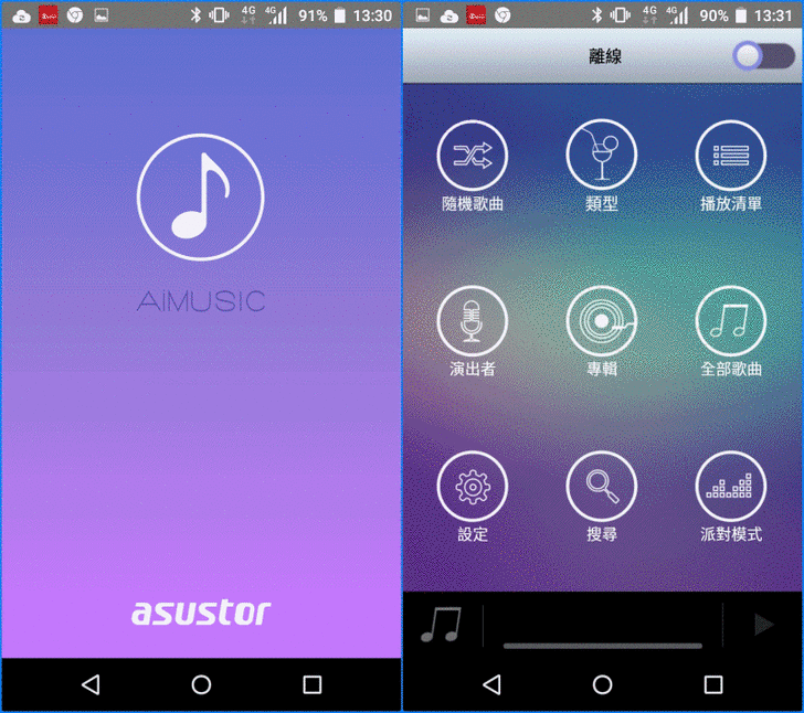 【▼】AiMusic 可讓行動裝置串流播放 NAS 中的音樂。輕輕鬆鬆從分類好的音樂收藏中點選要聽的音樂。而且AiMusic可離線本機播放,比上線功能差在資料夾瀏覽與下載任務的查看。