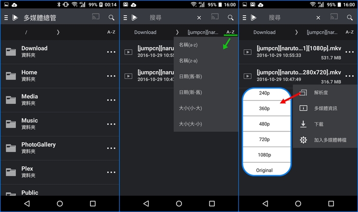 【▼】AiVideos->多媒體總管能輕鬆管理AS3202T所有資料夾內的影片檔案,不但能依名稱、日期新舊與檔案大小作排列外,亦能查看多媒體資訊,最棒的是能進行不同解析度的轉檔與下載作業。
