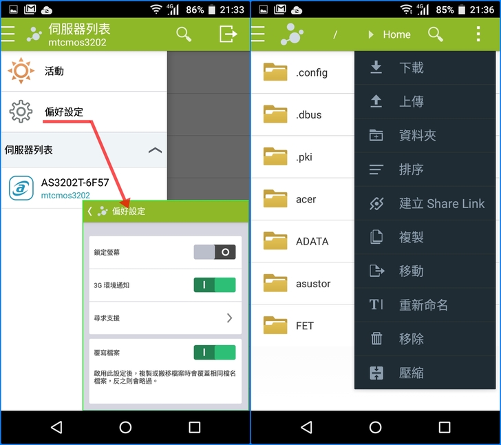 【▼】在AiData的主畫面中,能在資料夾路徑中執行檔案上下傳、建新資料夾、排序、建立Share Link、複製、移動、重新命名、移除與壓縮,而在偏好設定中,能設定鎖定螢幕、3G環境通知與是否複寫檔案等。