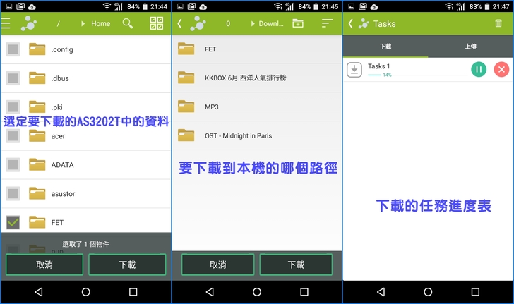 【▼】AiData進行下載的方式:一、選定AS3202T內要下載的目錄或檔案;二、選定要下載到本機的路徑;三、到選單中的 "活動" 查詢進度。
