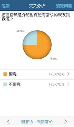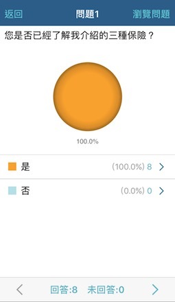 在外面跑業務的時間真的是分秒必爭,還好這個App會自動統計,我就可以隨時在手機查看結果,而且也能做交叉分析,好處是如果剛好客戶在旁邊,有什麼意見可以馬上處理,像是他對我剛剛介紹的產品有不懂的地方