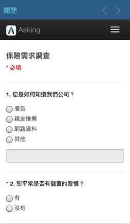 因為不知道方法,一開始我幾乎是以亂槍打鳥的方式在開發客戶,我那個朋友就有跟我說這樣不行,有時候花時間下功夫找真正的目標客戶遠比亂槍打鳥來得有效,所以後來我很認真的在想要怎麼找到真正有需求的人,我的直覺就是直接問是最快的,利用幾個問題判斷對方有沒有意願或是有沒有可能繼續發展成目標客戶,比我對任何人都用同一套方法有效的多,因為工作的關係,很常在外面跑,所以我就上網找有沒有類似問卷的App比較方便,就找到Asking,不過一開始我對問卷調查也沒有概念,問卷的設計、話術這些都需要慢慢累積,所以我就直接跟大家分享目前我的方式,根據你的實際狀況,還是要適時地做調整才能達到最好的效果