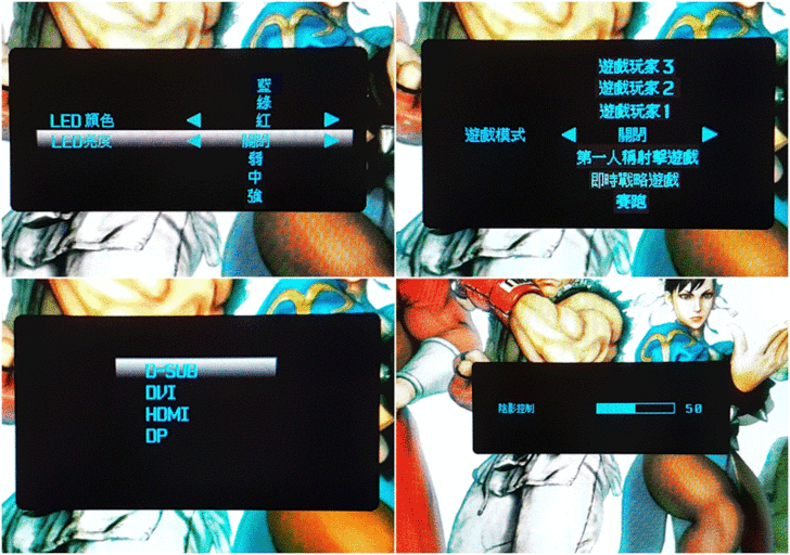 遊戲設定:遊戲模式(第一人稱射擊遊戲、即時戰略、賽跑、自訂三個遊戲玩家)、陰影控制(0-100)、遊戲色調(0-20灰階調整)、低藍光(弱中強)、Overdrive反應時間加速。