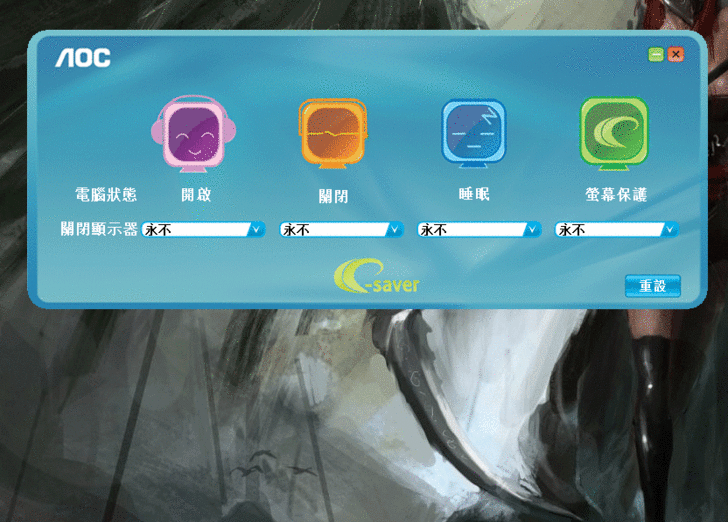 ▲e-Saver螢幕電源管理軟體:提供電腦狀態的顯示器,包含開啟、睡眠、螢幕保護的時間狀態設定,從永不、1分、2分到最長5小時後的時間來進行設定,不過就看個人喜好來進行搭配。