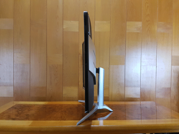 ▲AGON AG322FCX側邊的角度可動示範,角度可達-5.5°~23.5°,雖說向前仍有一定傾斜度,但茲因後方連接多個線材後會略為阻擋前傾的角度,使用後的主要調整還是以後仰為主。