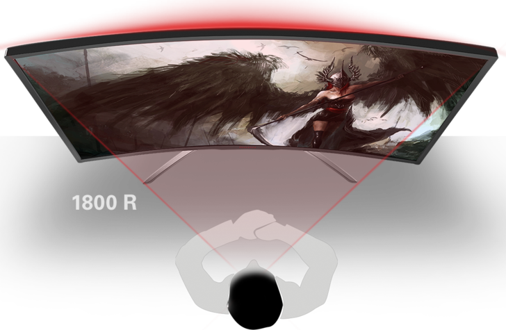 而提到曲面螢幕就不得不提到螢幕曲率,何謂螢幕曲率呢? 我們知道平面螢幕是電腦螢幕中最常見的,但是電腦螢幕應用曲面,會有什麼感覺? 簡單的說,就像我們去電影院看電影一樣,電影院的螢幕,也是曲面,曲面螢幕能讓我們觀賞螢幕時更有臨場感,而眼睛在觀看螢幕過久時較不會有不適感,也可以讓觀看的遊戲或者是電影等等較不易失真。以現今曲面來說,曲率有從4000R → 3000R 到1800R,而1800R,正是現今所謂最完美曲率,也是現今電腦螢幕中最小曲率!