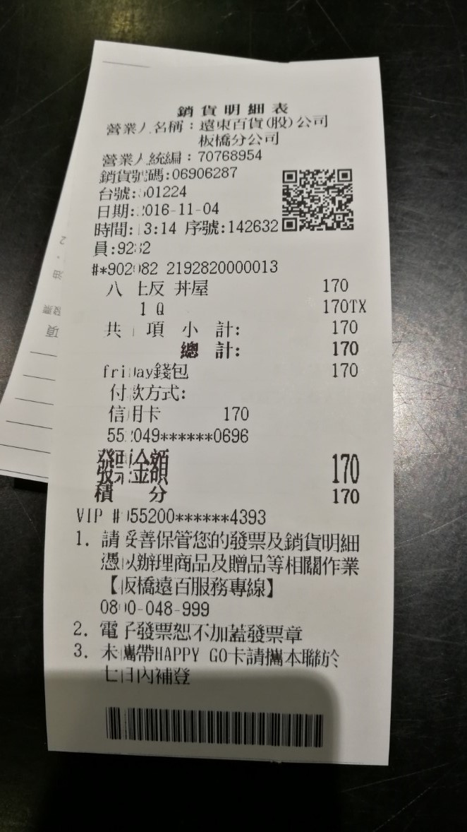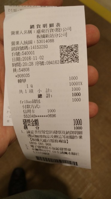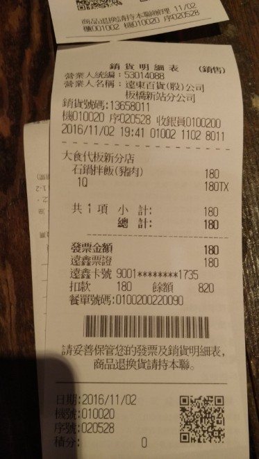 11月2日中午到板橋洽公,經過遠東百貨(是老店,不是大遠百喔)進去用餐,這次有綁了HAPPYGO卡號,條碼支付後直接登錄集點。