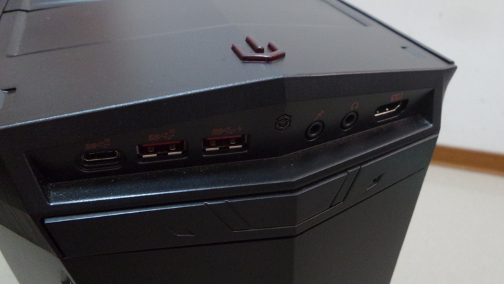 頂端紅色按鈕是電源開關、下方有著USB2.0、3.0和音源孔