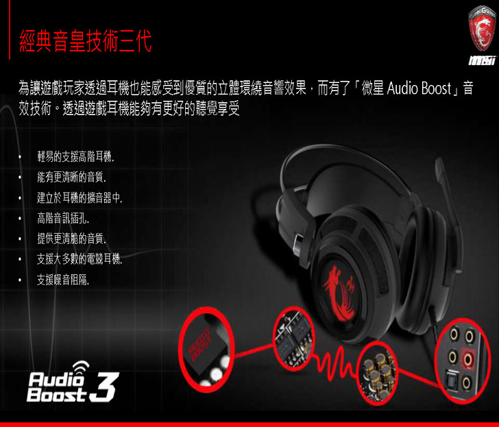 「微星 Audio Boost」音效技術。透過遊戲耳機能夠有更好的聽覺享受