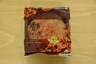 古早味肉餅的外包裝以深褐色為主,搭配簡單的花樣圖