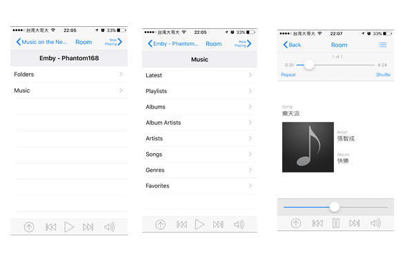 再接著選下去,就是剛剛建立好的 Emby 資料庫哦,Emby 有提供分類,所以也能看到像是 Playlist, Albums, Artiists, Songs, 等等,這些 Emby 會自動偵測音樂檔上的 metabeta 整理好好的~ XD.