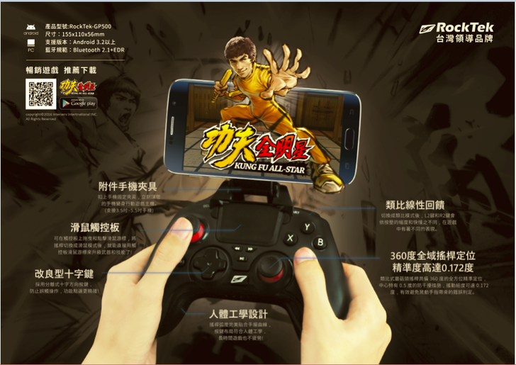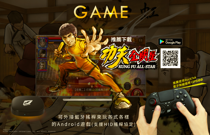 電視盒除了可以追劇,當然別錯過能玩最熱門的3D遊戲App! 台灣Android電視盒領導品牌RockTek雷爵科技已和遊戲大廠昱泉國際正式合作,讓RockTek全系列電視盒機種和藍芽遊戲搖桿,皆可流暢支援昱泉國際的熱門3D功夫動作手遊《功夫全明星》。使《功夫全明星》不再只受限於手機和平板小螢幕,透過RockTek的電視盒即搬上大螢幕電視上玩,更可搭配GP500藍芽遊戲搖桿進行遊戲操控,帶給消費者宛如家用電玩主機般的體驗。同時,昱泉國際《功夫全明星》還可讓玩家以同一遊戲帳號,出外用手機或平板透過藍芽連接RockTek GP500遊戲搖桿(附手機固定夾具)來玩,回家再用電視盒接大螢幕電視來接著進度繼續玩,給玩家們無縫接軌的跨屏體驗。